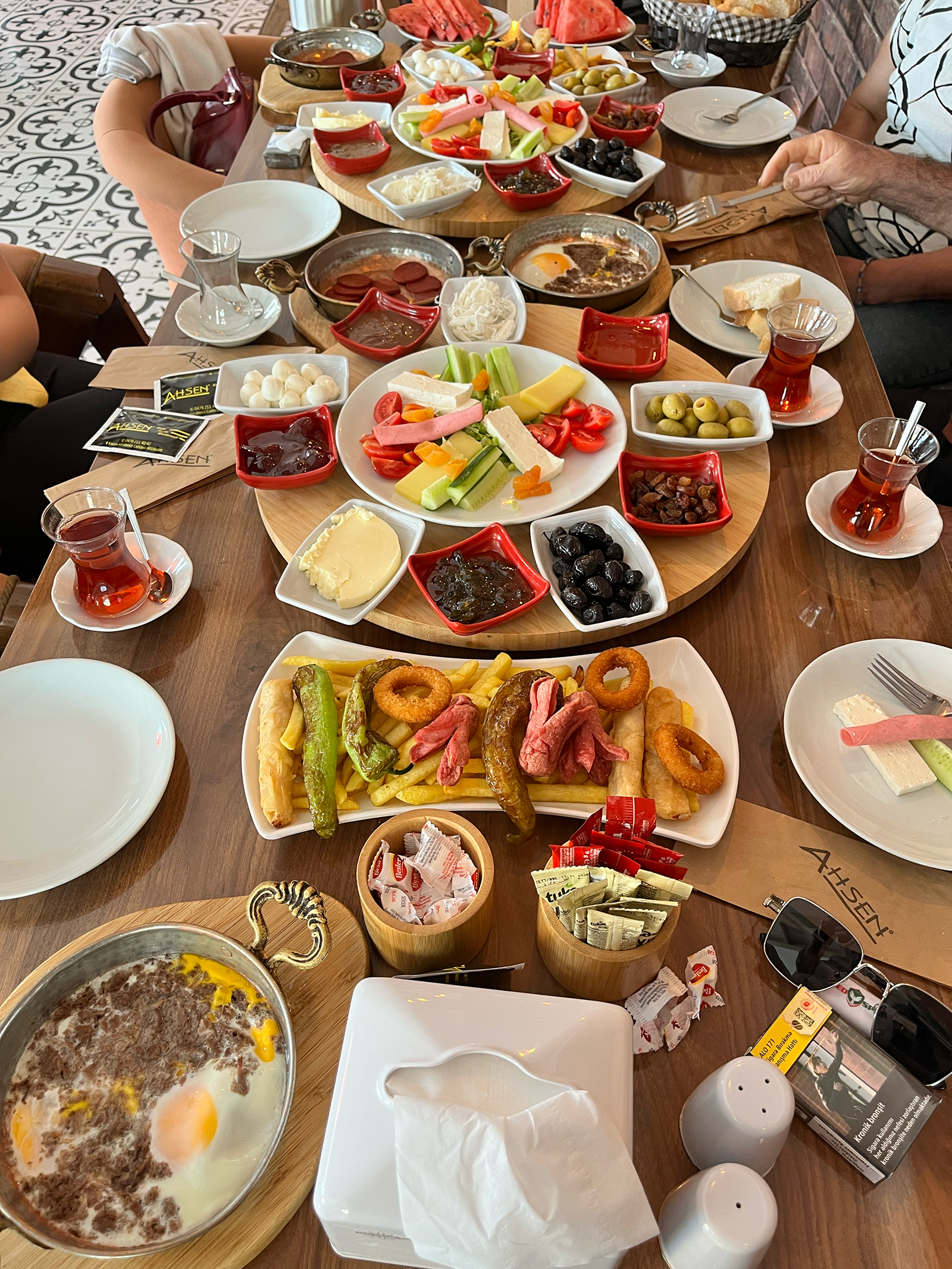 Çeri domates, salatalık, siyah zeytin, yeşil zeytin, beyaz peynir, taze kaşar, sigara böreği, reçel, tereyağı, bal, soslu elma dilim patates, yıldız sosis, sucuklu göz yumurta